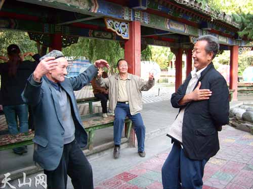 在乌鲁木齐人民公园里,汉族和维吾尔族市民共跳维吾尔舞。来源:天山网