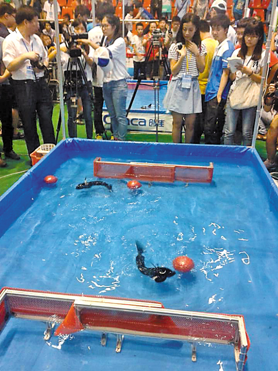 羊城晚报记者在大赛现场看到,来自北京大学、清华大学、复旦大学和荷兰、澳大利亚、韩国、英国等国54所国内外高校的300多名选手,进行了一场场“头脑风暴”式的较量。参赛大学生们通过改装、编程、调试“机器鱼”,从而让机器鱼完成救援、角力、踢足球乃至花样游泳等高难度动作,角逐全局视觉组、自主视觉组、2D仿真组、自由创意组等四组及仿真组花样游泳、协作过孔、全局组水球、水中角力等15个项目的桂冠。