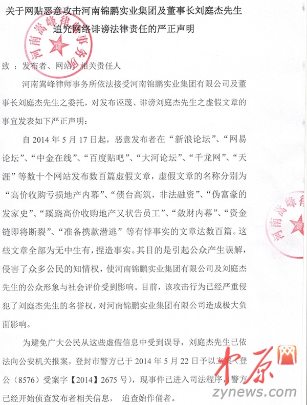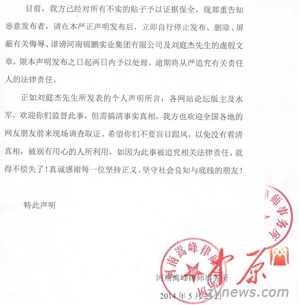河南锦鹏实业集团的委托律师河南嵩峰律师事务所史金峰称:贴子目的是为了引起公众产生误解,侵害众多公民的知情权,使河南锦鹏实业集团及刘庭杰的公众形象与社会评价受到负面影响。为此,我们认为数百篇的发贴量已经远远超过了普通网民监督发牢骚的界线,目前,该攻击行为已经严重侵犯了刘庭杰的名誉权,也对锦鹏集团造成极大负面影响。我们会同相关机关已经对所有不实贴子进行证据保全,现郑重告知恶意发布者,请立即自行停止发布、删除、屏蔽有关侮辱、诽谤河南锦鹏实业集团有限公司及刘庭杰的虚假文章,否则我们将严格追究全部的法律责任。