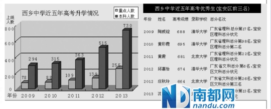 位于宝安区滨海一侧的西乡中学,全力实现“低进优出,高进特出”的目标,屡创奇迹,不断刷新高考成绩新纪录。2012年高考,邱惠怡同学以674分的高考成绩名列广东省文科总分第6名、深圳市第2名、宝安区第1名,并以146分的成绩夺取深圳市英语单科状元,被清华大学录取;庄秋玲同学以664分名列广东省文科总分第26名,被北京大学录取。