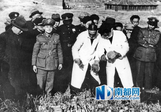 1946年中国军事法庭庭长石美瑜、首席检察官陈光虞等在检验从雨花台荒野中挖掘的遇难者尸骨。