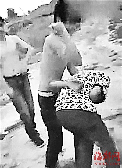 视频中,三名男子围殴一少年,肘击、脚踢、用石块砸
