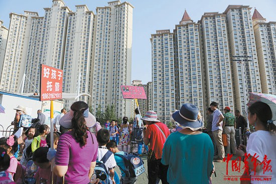5月22日,河北燕郊汇福实验小学,放学时门口挤满了家长和举着“托管”字样牌子的“小饭桌”阿姨。