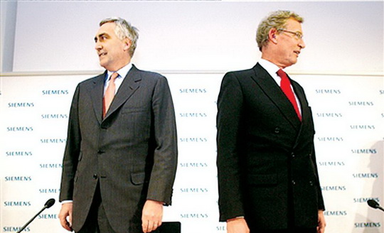 在德国慕尼黑,西门子公司总裁彼得·勒舍尔(左)和监事会主席格哈德·克罗默准备出席新闻发布会。当天,西门子公司宣布,将向美国和德国方面支付巨额罚金,了结困扰公司两年多的贿赂案。