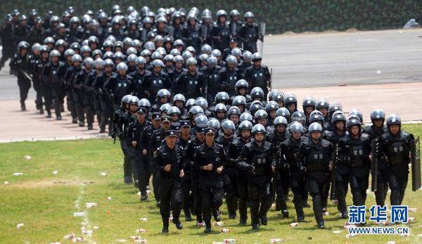5月27日,参加反恐演练的防暴警察赶往“事发地”处置。当日,来自浙江省各地公安机关的武警、特警、海警、消防、警卫等部门的近千名反恐精英来到浙江省绍兴市,举行浙江省公安机关“特警3号”反恐维稳汇报演练,参演人员表演了包括擒敌技能战术、男女长短枪应用设计、要人警卫、武警反恐特战演练、暴力恐怖事件实战处置等9个演练课目,并展示了10大类、88项反恐维稳装备及车辆。来自浙江省各反恐成员单位、沪苏皖公安系统代表及媒体代表观摩了此次演练。新华社记者 王定昶摄