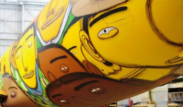 近日,在巴西贝洛里奥藏特,巴西世界杯期间巴西国家队专机曝光。机型为波音737,涂装相当“鲜艳”—画满了卡通的球迷头像,由艺术家Os Gêmeos耗时一周完成,用掉了1200罐涂料。主色调为巴西国旗颜黄,老旧的波音737一旦被喷上彩绘,便溢出桑巴热情。机身上的卡通球迷简直萌透了,可惜它只供东道主巴西队独家使用。