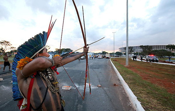 巴西土著居民抗议世界杯 佩弓箭与警方对峙(图)
