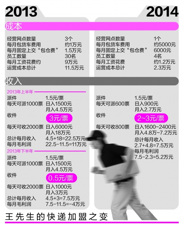 按照王朋的说法,记者算了一笔账:去年上半年以前,王朋的网点每天平均派件1000票,自己可得1.5元/票;收件2000票,自己可得3元/票。按此计算,网点一个月总收入为22.5万元。除去11.5万元的固定成本,每月还有11万元的毛利润。