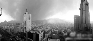 图为浓烟笼罩下的威海。
