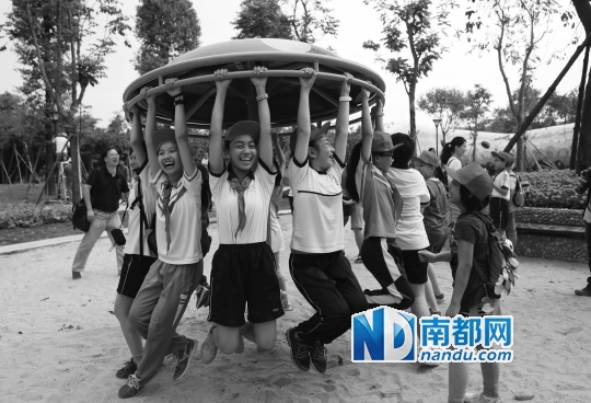 5月29日,广州海珠儿童公园,学生代表在野人乐园体验游乐设施。南都记者 冯宙锋 摄