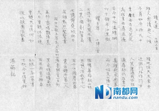 汤芗铭给章士钊信中的“呈赠主席诗抄件”。