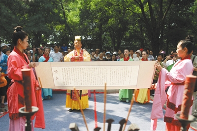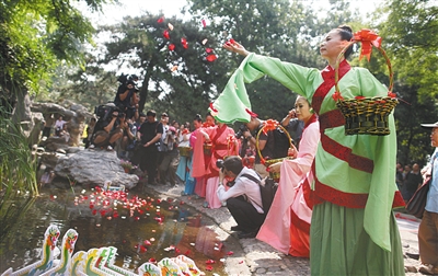 昨日上午,陶然亭公园在为纪念屈原而设立的独醒亭景区举办了祭祀礼仪展示活动,数名演员身着汉服在“汨罗江”畔向游客展示汉朝祭祀舞蹈,民俗专家高巍朗读了祭文(左图),大家还将寄托哀思的花瓣撒向“汨罗江”中,以示对爱国主义诗人屈原的纪念(右图)。当天,陶然亭公园龙舟表演正式拉开序幕,专程从湖南省汨罗市定制的龙舟,吸引了不少游客。新京报记者 薛珺 饶沛 摄影报道