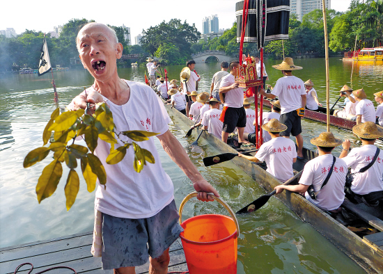 昨天是端午节,一大早,荔湾湖上锣鼓喧天。泮塘族人要迎接“契爷”——南海盐步老龙大驾光临。同时,还有杨箕、坑口等5条兄弟村的龙舟也要前来“赠兴”。
