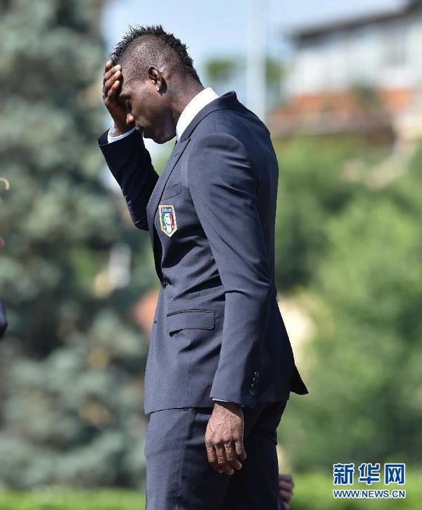 6月3日,意大利国家队球员巴洛特利亮相拍摄现场。 当日,意大利国家足球队在佛罗伦萨拍摄官方全家福照片,准备踏上巴西世界杯的征程。新华社发(阿尔贝托·林格里亚摄)