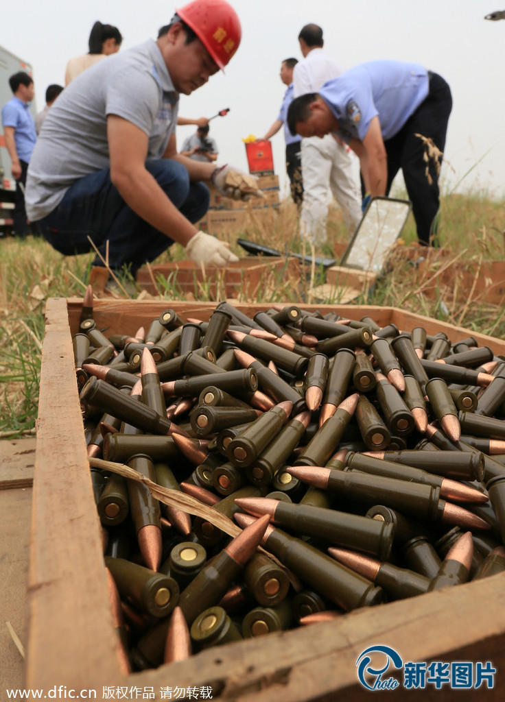 2014年6月4日,河南省郑州市,在黄河滩边一处荒地,随着一声巨响,省会警方在“缉枪治爆”专项行动中收缴的1775公斤炸药、16900枚雷管、26500发子弹和150枚废旧炸弹及爆炸装置被集中引爆销毁,现场升起巨型“蘑菇云”。卢键/东方IC