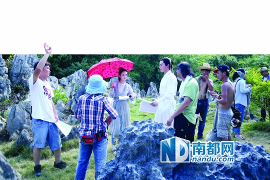 广西的夏天异常炎热,演员们穿着古装戴着发套,许多人都热得长痱子了。02-03版摄影:刘宾