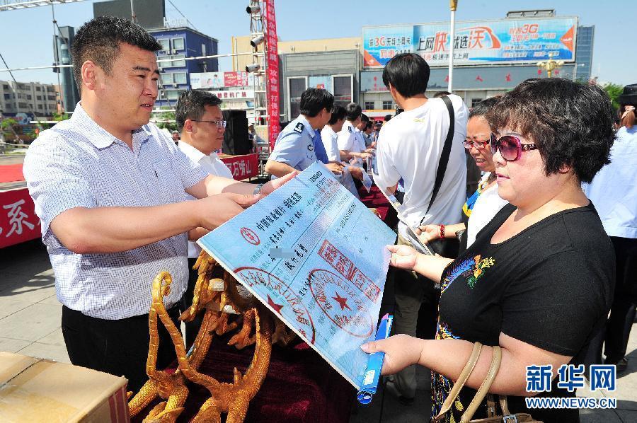 6月6日,在宁夏石嘴山市大武口区集中返赃大会现场,部分诈骗案受害者正在领回损失。当日,宁夏回族自治区石嘴山市大武口区召开“攻命案,打侵财”集中返赃大会,把今年以来收缴的共计543.35万元的赃物和现金进行集中返还,最大限度地为民众挽回经济损失。据了解,今年1月至5月,石嘴山市大武口公安分局破获刑事案件570起,其中侵财类案件493起。 新华社记者 彭昭之 摄