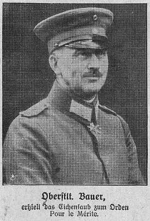 马克斯·鲍尔,1869年出生在德国一个中产阶级家庭,成年后投身于军界。第一次世界大战爆发时,他在德军参谋本部作战处任少校参谋,当时他的顶头上司、上校处长便是后来的德军名将鲁登道夫。鲍尔所擅长的是重炮设计专业,并在军事理论上有所创新,曾自己设计过新型重炮,为此荣获柏林大学荣誉博士学位。第一次世界大战爆发后, 1916年8月,鲁登道夫升任德军参谋本部副总参谋长,鲍尔也随之得以提拔,晋升上校。