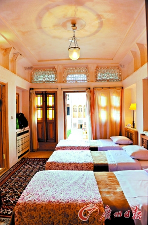 一进酒店大门,会差点让人忍不住要尖叫,眼前精致的一切让人有些不敢相信,酒店的面积之大自不用说,更值得一提的是,这里的墙壁和天花板上布满了密密麻麻的用红、蓝宝石与小块镜子相间而成的几何形图案,就连家具也用繁琐细密而不断重复的图案装饰着,而镂空雕刻的具有波斯特色的装饰板和金属装饰物则被有技巧地安放在能锦上添花的位置。大厅后还有一座花园,像其他传统波斯建筑一样,花园中央是一方水池,而花园四周则环绕着当地特色的两层连续拱门。这简直像一座皇家御用的行宫。虽然隔着几百年的历史,却仍然可以感受到萨法维王朝的繁荣气象。想当年,各国进贡的商旅都云集在此,只有如此气派的驿站才足以彰显帝国的强盛。