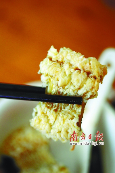 虾胶上裹了一层紫菜,香脆可口,虾鲜味与紫菜的甘香相互渗透,入口新鲜爽脆。