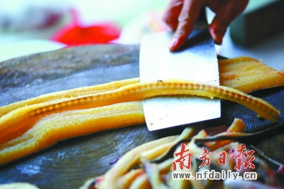 杜龙,形似蛇,其实是条鱼。生长于咸淡水交界,生性活跃。在潮汕地区,杜龙金贵得可以当做探亲的好礼,是体面的象征,甚至在高档酒楼里都难得一见。在一些潮汕酒楼里,杜龙一斤可卖到逾200元,但这售价并非贵得全然无理:一方面它属于纯野生货,养殖不得,稀少且具有较高的营养价值;另一方面,它尤其考验厨师的刀工。不夸张地说,要将杜龙物尽其用,需要厨师身怀绝技。