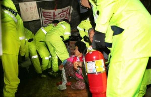 6月6日,一位年事已高的韩国老太脱光衣服,全裸躺在示威所内与其他居民一起抗议政府的拆除行为。警察试图将示威民众从示威所中拉出,在这一过程中有民众受伤。11日,居民们在示威所周围手持易燃物和铁锁链等物品与警方继续对峙,有140人集结在村子入口处,129人集结在示威所前,大部分示威者是中老年人。