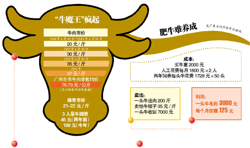 在这种情况下,牛的供应与需求不协调。记者了解到,以前广州本地和从化都有牛的养殖场,但是这几年已经匿迹。2010年后,广州大规模扶贫,从化当下的牛养殖业方稍有起色。根据往年公布的数字,广州每天消费的活牛约为500头,每年出栏的肉用牛不够广州人吃20天。