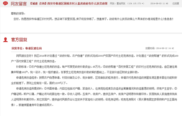 人民网西安6月12日电(肖翔)近日,西安临潼区一农民向临潼区委书记留言称自家住房濒临坍塌,询问贫困户盖房的相关扶贫政策。6月12日,临潼区建住局对此作出回复,建议该农户提交申请,通过“政府帮建”的形式完成危房改造。
