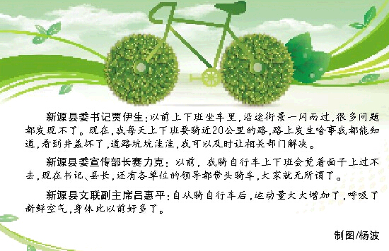 该县县委常委、宣传部长赛力克说:“前两天,我才从伊宁市买了辆自行车。以前,我骑自行车上下班会觉着面子上过不去,现在书记、县长,还有各单位的领导都带头骑车,大家就无所谓了。”赛力克告诉记者,倡议书主张在县城内办事不使用公务车,骑车办理。有3种情况可以不必:身体不宜,下雪(雨)天,下乡。