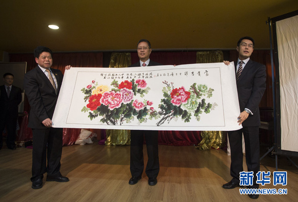 图为国务院侨办副主任何亚非(中)向阿根廷阿中福清会馆赠送国画。右一为中国驻阿根廷使馆政府参赞朱京阳,左一为阿中福清会馆董事局主席陈瑞平。