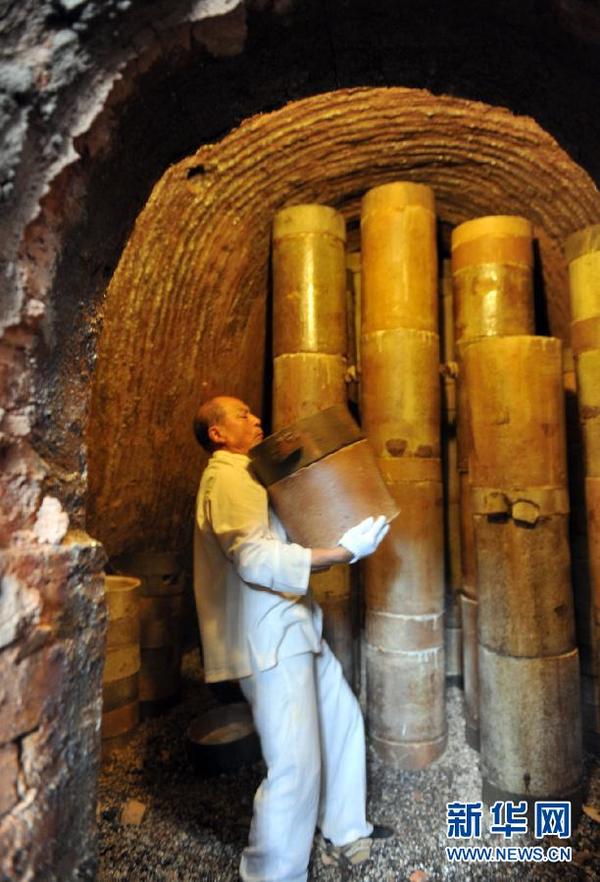 新华社照片,景德镇(江西),2014年6月14日 景德镇五年“复活”十种古代瓷窑 6月14日,景德镇古窑民俗博览区明代葫芦窑开窑,著名把桩师傅胡家旺在开窑。当日,作为中国文化遗产日主场城市,景德镇在古窑民俗博览区举办了一系列活动,清代镇窑点火复烧、明代葫芦窑开窑,明早期御器厂三种专用窑式的“复活”更使得自2009年清代镇窑复烧后古代窑炉“复活”种类达十种之多,参观者在这一景区可以完整地看到景德镇古代窑炉的发展历史。一大批窑炉的“复活”、“复烧”使得一批濒于失传的老手艺得以保护、延续,但作为人类非物质遗产的古代陶瓷制作技艺的传承仍任重而道远。新华社记者章武摄