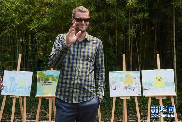 6月14日,大黄鸭的设计者、荷兰艺术家霍夫曼参加爱心公益活动,他身后展示的是自闭症儿童创作的大黄鸭作品。新华社记者 徐昱 摄"