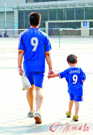 爸爸穿大九, 宝宝穿小九。 大手牵小手, 一起踢球球。 记者曹景荣摄