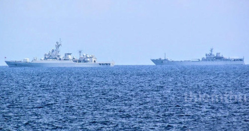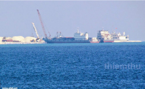 中国在赤瓜礁填海造陆,护卫舰近距离警戒。(资料图)
