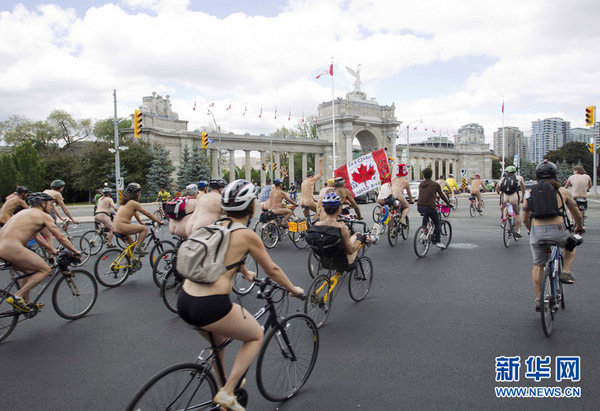 加拿大多伦多6月14日举行了2014年裸体骑车活动,吸引了数百位参与者。这项全球性活动始于2004年,旨在呼吁减少使用汽车与环境保护,每年会在全球70余个城市进行。图为活动参与者在裸体环保骑行活动中。新华网 邹峥 摄