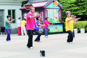 昨日晓港公园内,几个老人家听着收音机打太极。