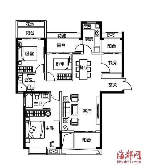 因为业主想要整体空间显得宽阔一点,可以把东面与书房相连的阳台设计成与书房一体,这样可以扩大书房的空间,也让书房显得更加明亮。另外,可以在中间的阳台中隔断出一小片面积,主要是用于放置厨房的冰箱,使得厨房整体的空间可以往北边移动,这样在餐厅空间上遗留下来的面积就可以显得很宽敞,满足了业主对空间的要求。此外,中间阳台剩下的部分可以与中间卧室结合在一起,又可以扩宽卧室的空间,方便业主使用。