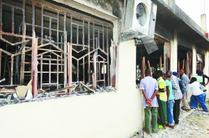 武装人员15日晚焚毁了多栋建筑物,包括旅馆、餐厅、银行和政府办公楼。一天过后,不少楼房仍在冒出浓浓白烟。