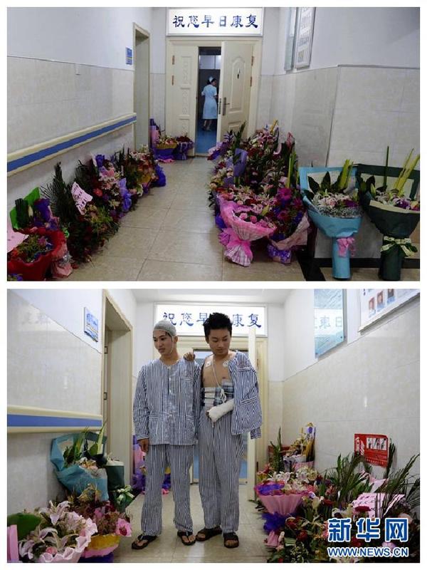 上图:6月11日,在宜春市人民医院,柳艳兵和易政勇病房门口的过道上摆满了各界人士送来的鲜花。下图:6月16日,柳艳兵(左)和易政勇相互搀扶着走出病房(拼版照片)。新华社发(陈子夏摄)