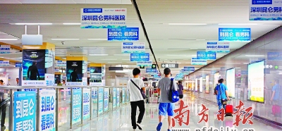 地铁站,原本应该是一个清新整洁的候车场所,但近来有不少市民向南方日报反映,在深圳地铁1号线的部分站厅里,充斥着某男科医院的广告。有市民就此提出质疑,公共空间难道不应该考虑市民的感受吗?为何地铁站厅商业广告泛滥,却少了公益广告的身影呢?