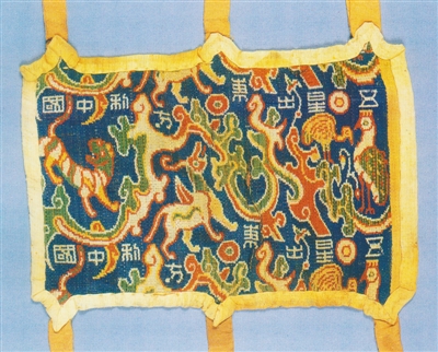 图一:“五星出东方利中国”织锦护臂,东汉中后期。长18.5厘米,宽12.5厘米;两边缝缀的白色绢带各有3条,长约21厘米、宽1.5厘米。织锦是五重平纹经锦,经密220根/厘米,纬密48根/厘米。现藏于新疆维吾尔自治区文物考古研究所。