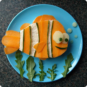 小丑鱼尼莫三明治:这个快乐的、胡萝卜色的三明治是一家英国公司Funky Lunch的杰作。他们这个工作室用创造性的食物鼓励孩子们健康饮食。这三文治看上去像小丑鱼尼莫或者枪鱼吗?不管怎样,至少有蓝纹奶酪和黄椒做的平底船在旁边陪着它。