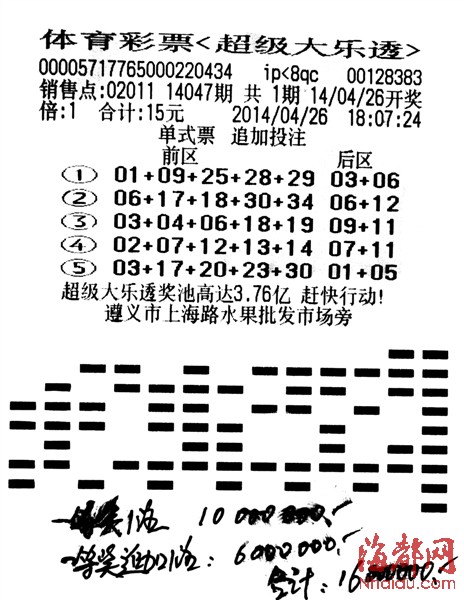 超级大乐透第14047期爆出喜讯,全国中出一等奖1注,追加投注1注,而这唯一的1注一等奖奖金高达1000万元,追加投注奖金高达600万元,合计1600万元的巨奖降临历史名城贵州遵义。