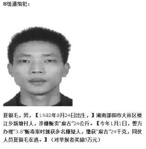 B级通缉犯夏银毛,男,湖南邵阳市大祥区檀江乡新塘村人,涉嫌贩卖“麻古”24公斤。(对举报者奖励5万元)