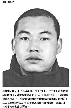 A级通缉犯张亮祖,男,辽宁盖州市九寨镇骆驼岭村人,涉嫌贩卖冰毒30公斤。(对举报者奖励10万元)