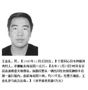 B级通缉犯王金礼,男,宁夏同心县韦州镇河湾村人,涉嫌贩卖海洛因20公斤。(对举报者奖励5万元)