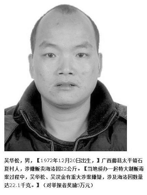 B级通缉犯吴华松,男,广西藤县太平镇石夏村人,涉嫌贩卖海洛因22公斤。(对举报者奖励5万元)
