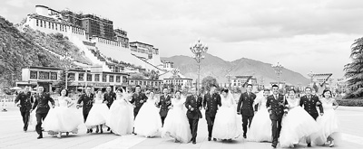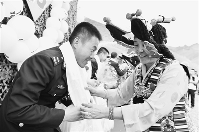 日前,西藏军区某部在海拔4000米野外驻训点,为11名官兵举办了一次别具一格的集体婚礼活动。共建单位拉萨市阿坝林社区藏族群众得知喜讯,纷纷带上洁白的哈达、甘甜的美酒,赶来祝福军中新人,进一步激发了官兵扎根边疆、戍边卫国的决心。