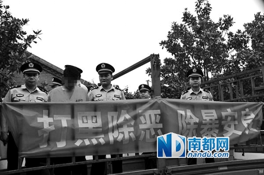 9张照片中,8张都是退赃大会的过程,1张则是多名干警押着1名嫌疑人站在敞篷卡车上,车身还挂着“打黑除恶除暴安良”的横幅,嫌疑人未戴面罩。正是这张照片令固始县公安局陷入争议。