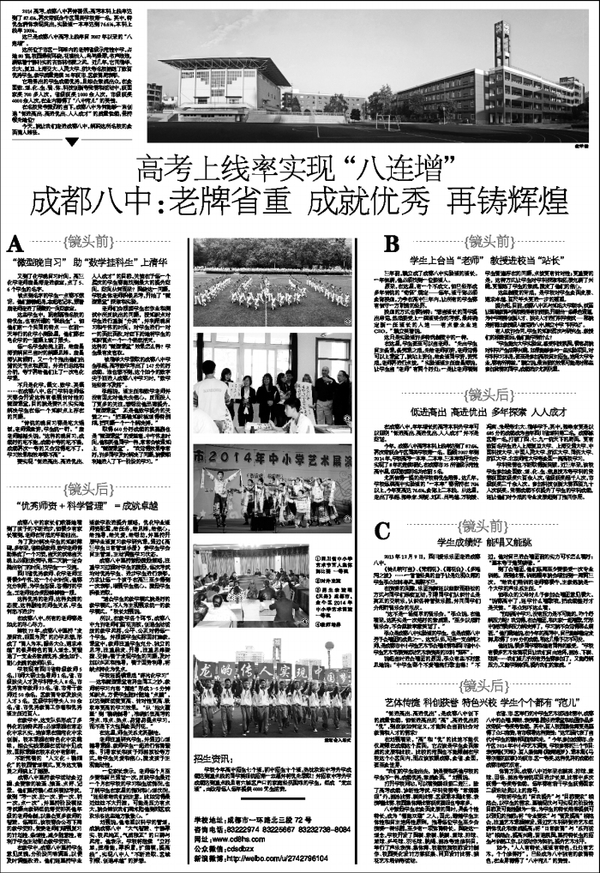2014高考,成都八中再传喜讯:高考本科上线率达到了87.6%,再次荣获金牛区同类学校第一名。其中,特优生群体表现突出,实验班一本率达到76.6%,本科上线率100%。